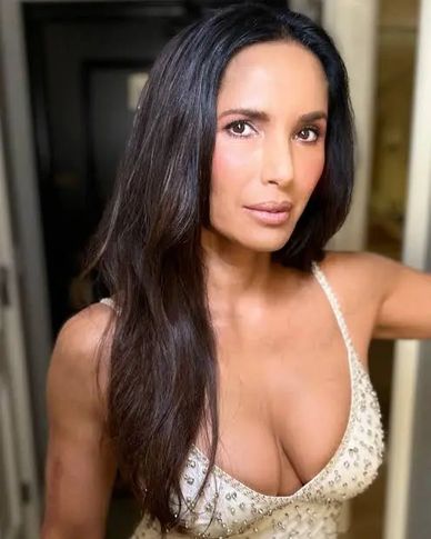 Her dark brown hair is styled true to her signature look — parted in the center, with two long tendrils cascading softly along each side of her glowing face, while the rest falls back with refined simplicity. Her warm brown eyes reflect intelligence, sensuality, and a quiet, confident charisma — the kind that only comes from truth and talent.